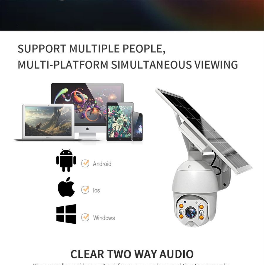 4. Panoramica panoramica e inclinazione più ampia& Telecomando --- La telecamera solare ptz offre angoli di visione di rotazione orizzontale di 360° e verticale di 120°. Supporta il controllo remoto della direzione sul telefono. Con funzionalità di zoom digitale 3x e condivisione multiutente, che offre una visione più flessibile e più ampia per te e le famiglie per monitorare la tua casa in una visione a 360 gradi in tempo reale. La scelta di una telecamera solare per esterni protegge la tua casa 24 ore su 24, 7 giorni su 7.